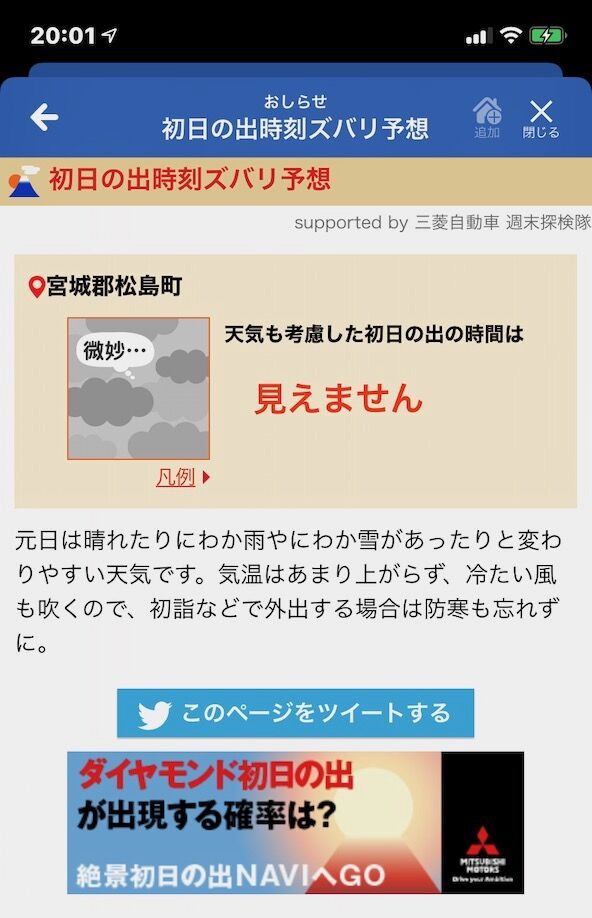 2019年12月31日 明日の初日の出は 久しぶりに初日の出を見れるシフトでしたがウェザーニュースさんの情報では少し前の予報では見える予定でしたがこんなにはっきり言われると、すっきりゆっくり寝てようと思いました 「天気」カテゴリの最新記事 < 前の記事次の記事 > コメント コメントフォーム 名前 コメント 評価する リセット リセット 顔 星 投稿する 情報を記憶