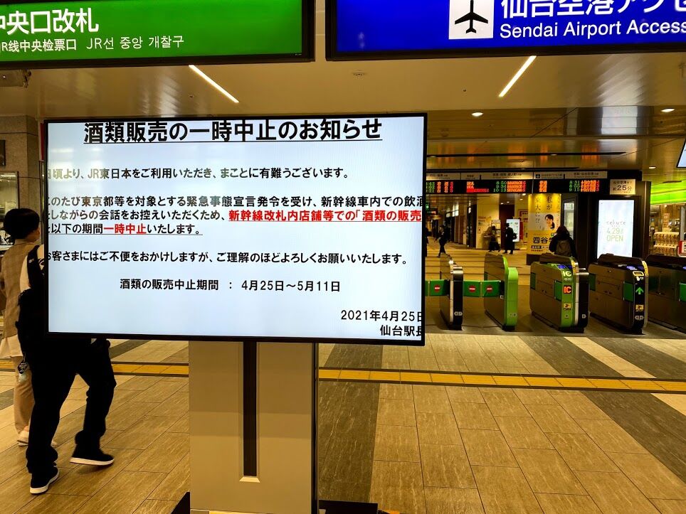2021年04月25日 緊急事態宣言 東京都などでの緊急事態宣言を受けて、仙台駅にも影響が...ニュースでもやってなかったと思いますが、仙台駅での新幹線改札内でのお酒の販売が一時中止になっています本日から5月11日までのようですこの期間に新幹線に乗る予定は無いのでいいんだけど...宮城県の「マンボウ」=「まん延防止等重点措置」が5月11日まで延長されました各所に影響が出てますね 「鉄道」カテゴリの最新記事 タグ :#仙台駅 < 前の記事次の記事 > コメント コメントフォーム 名前 コメント 評価する リセット リセット 顔 星 投稿する 情報を記憶